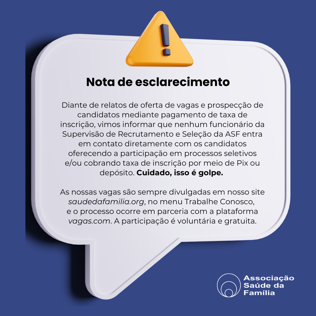 Neste local você encontrará informações e dicas para participar dos processos seletivos realizados pela Associação Saúde da Família. Há mais de dez anos, somos parceiros da VAGAS.COM, nossa principal plataforma de recrutamento. Os nossos processos seletivos são divulgados no site da ASF e toda a comunicação com o candidato é realizada por e-mail dentro da plataforma VAGAS.